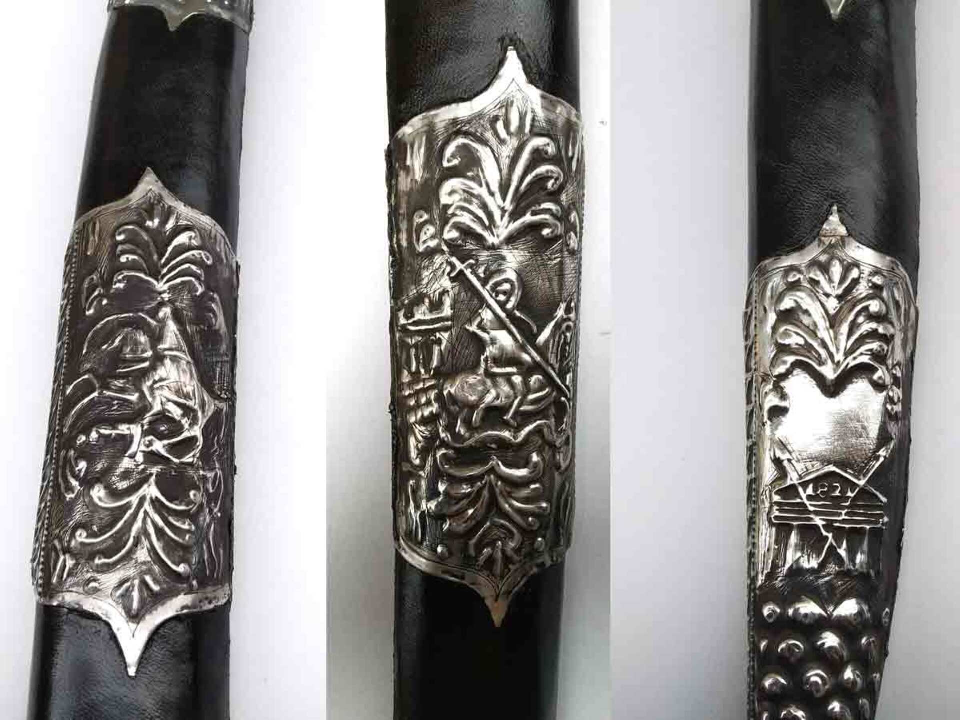 An intricately crafted replica of a traditional yataghan from the region of Epirus, Greece. The scabbard is made from peeled oak wood, clad in a silver-copper alloy and richly decorated with detailed engravings depicting scales, war trophies, floral patterns, banners, and Saint George.