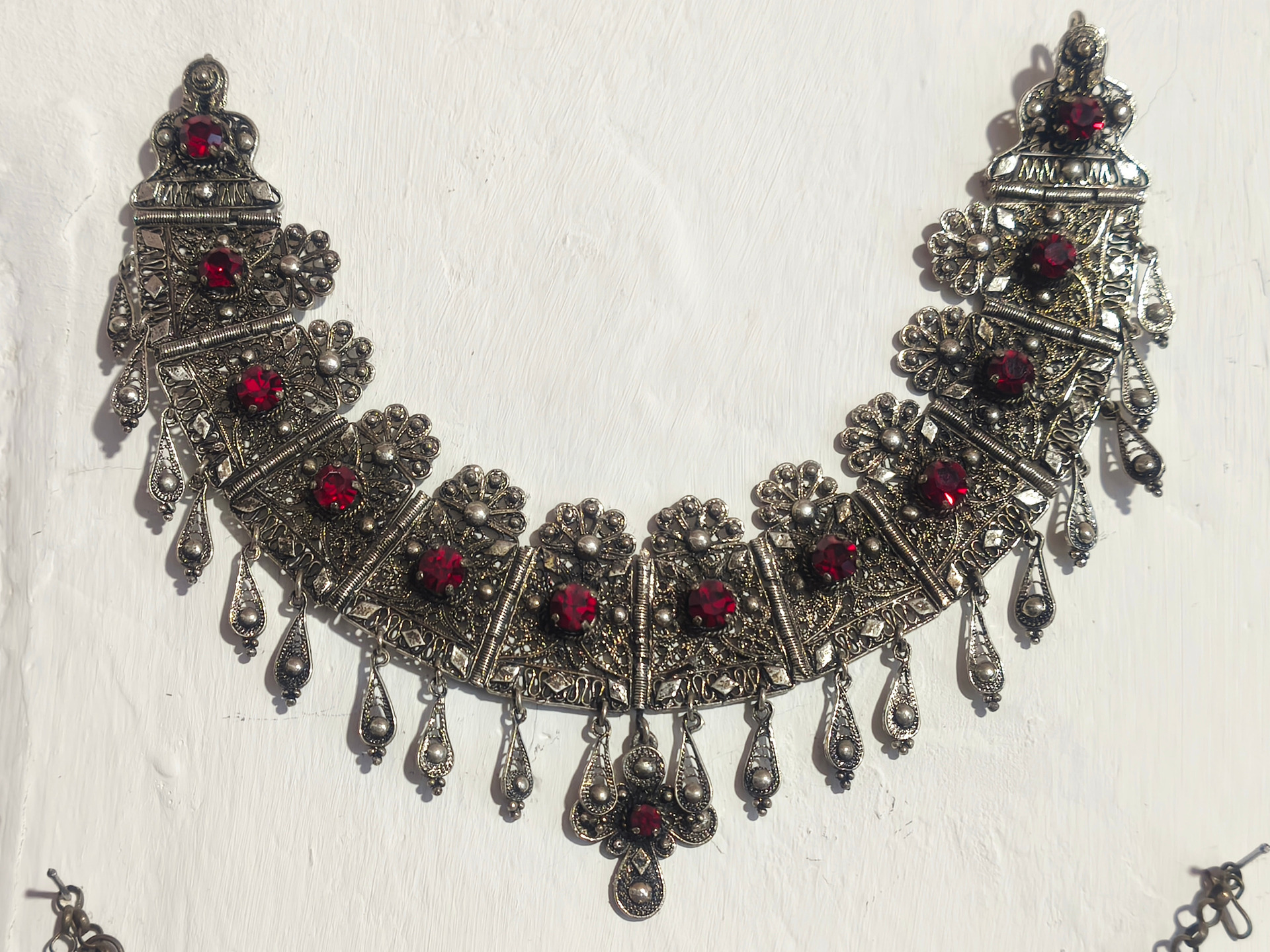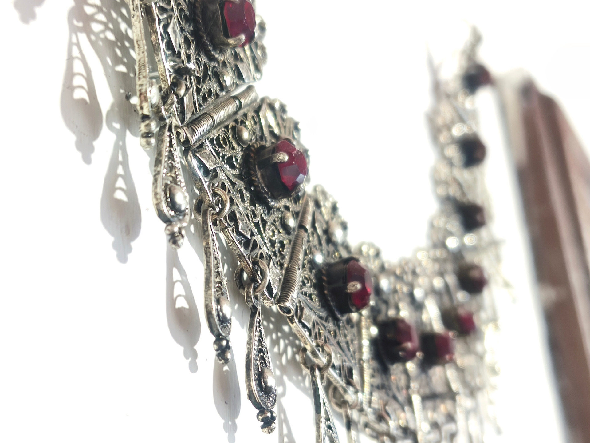 Women's wire jewelry that decorates the neck of the Janissary/Boula. Handcrafted with fine silver wire which is joined together and forms figures with flowers and geometric shapes. Nine red stones decorate the entire jordan and below hang teardrops with curved carvings.