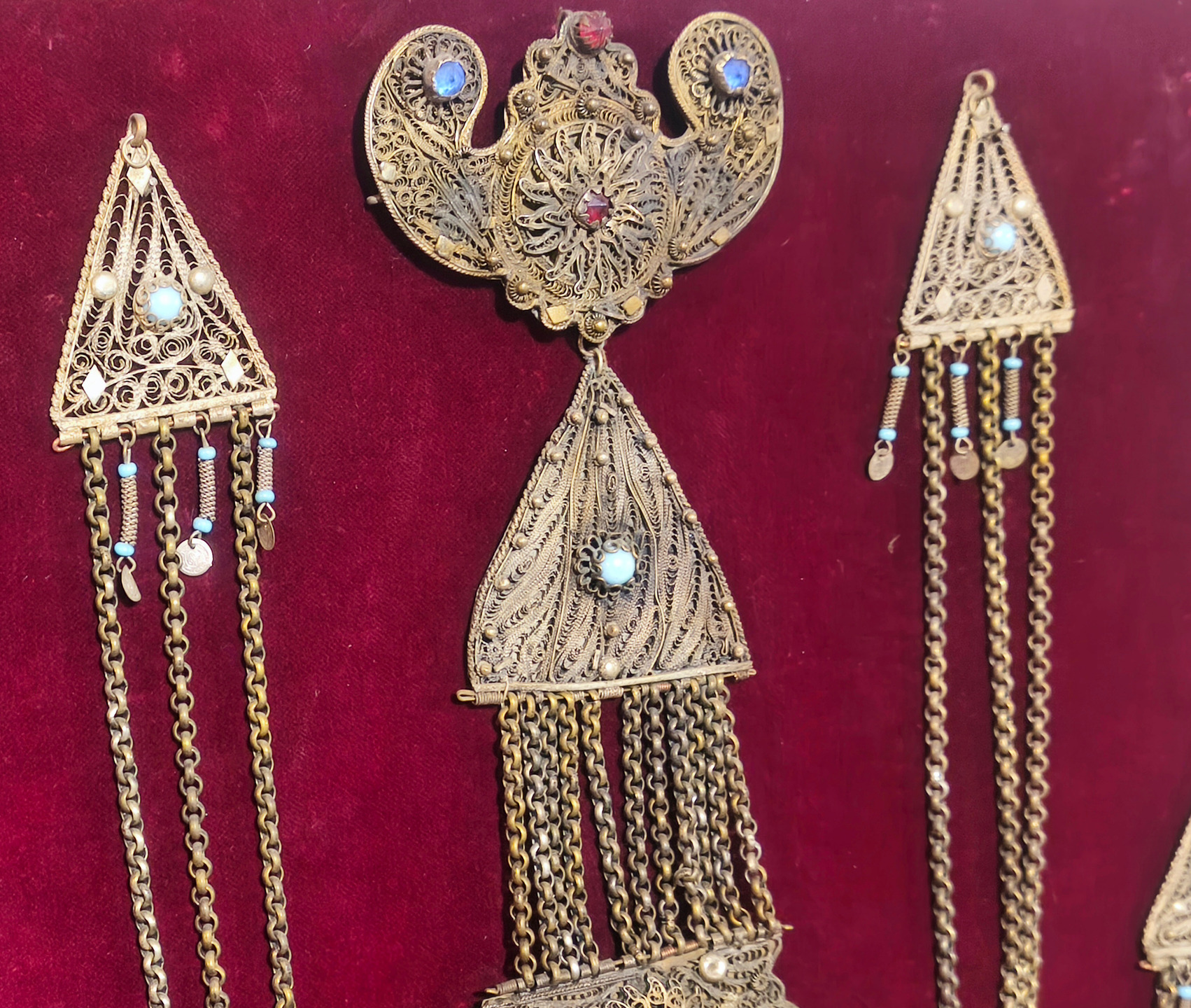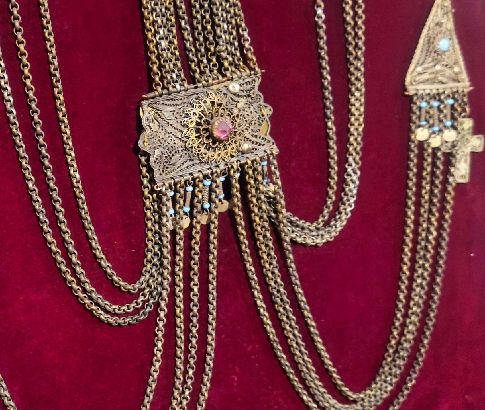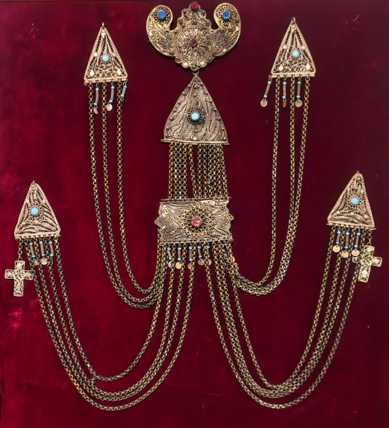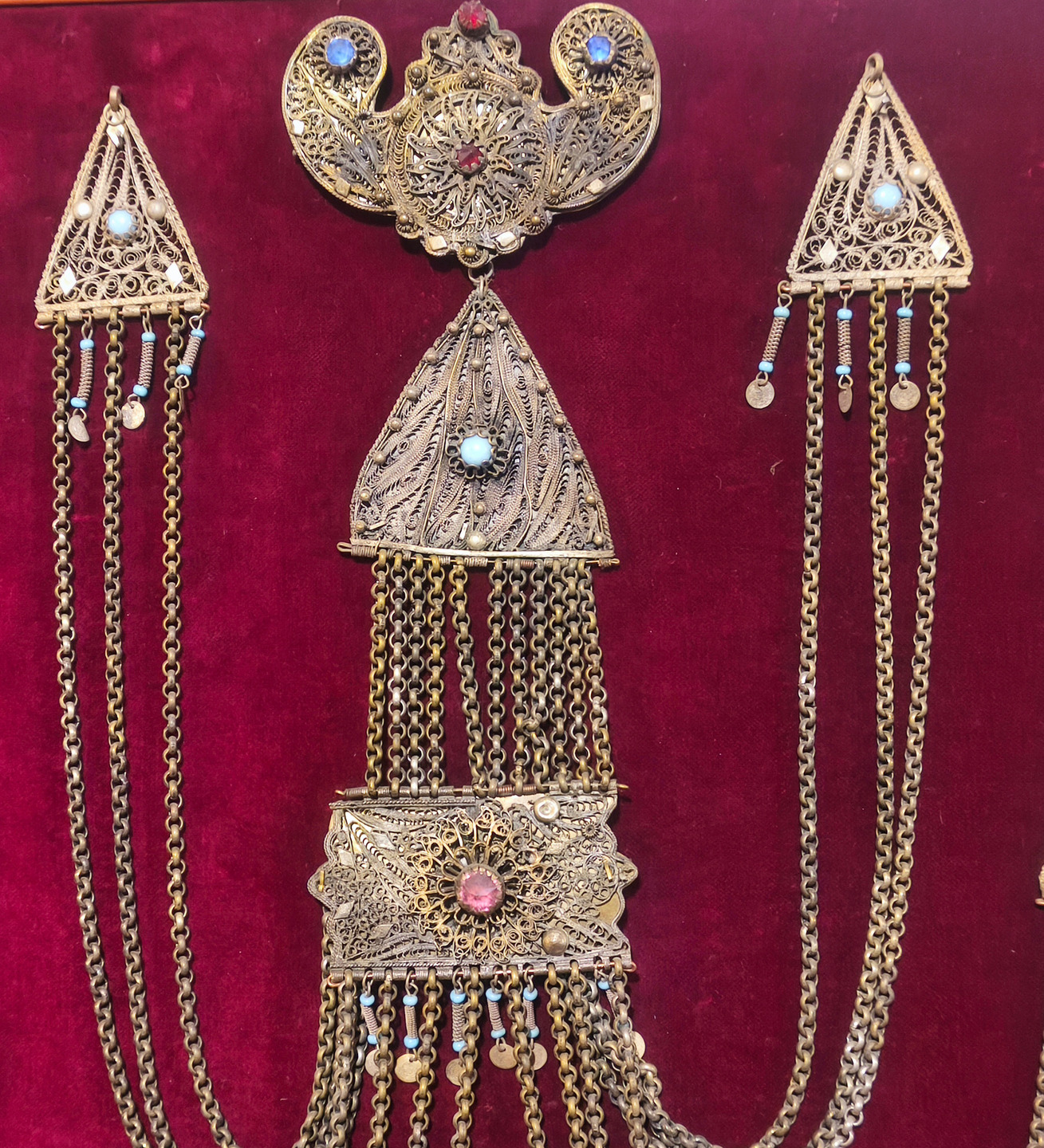 An authentic handcrafted reproduction of a traditional Macedonian kiousteki, meticulously created using the fine filigree wirework technique. The piece consists of triangular and rectangular elements connected by 10 mm chains, adorned with colorful stones and small metallic pendants.