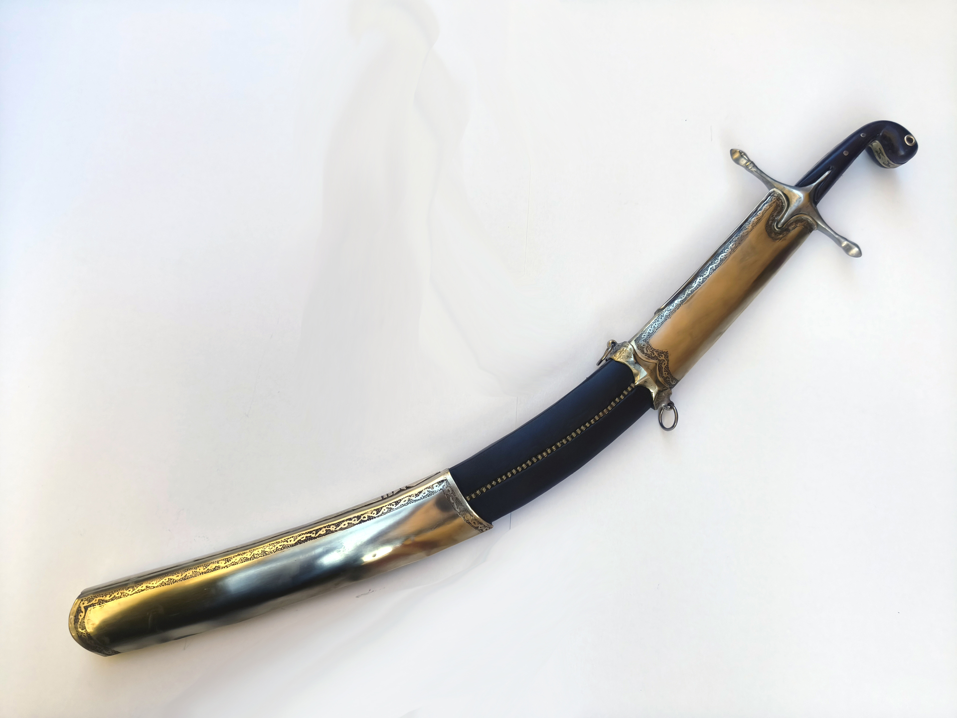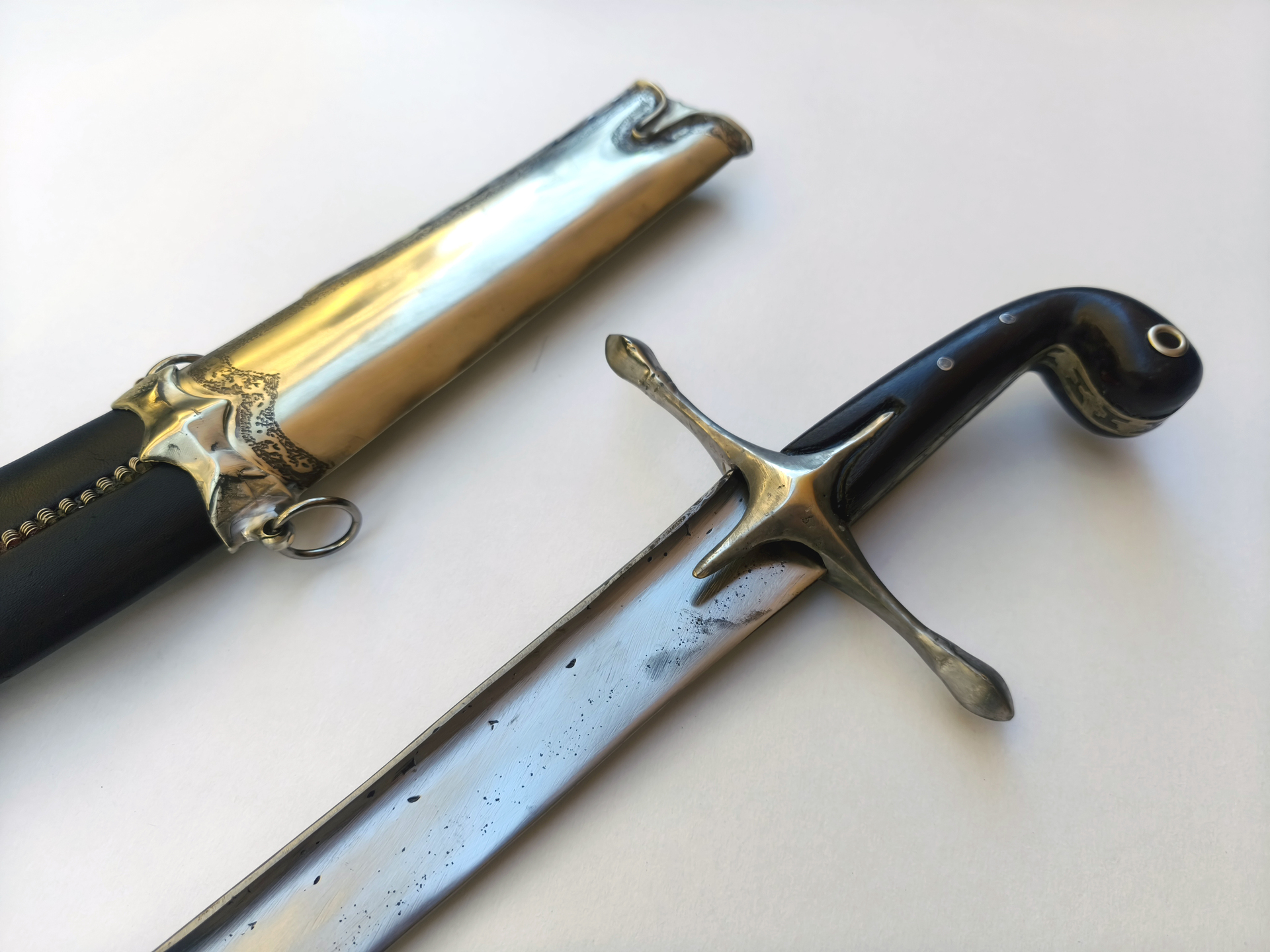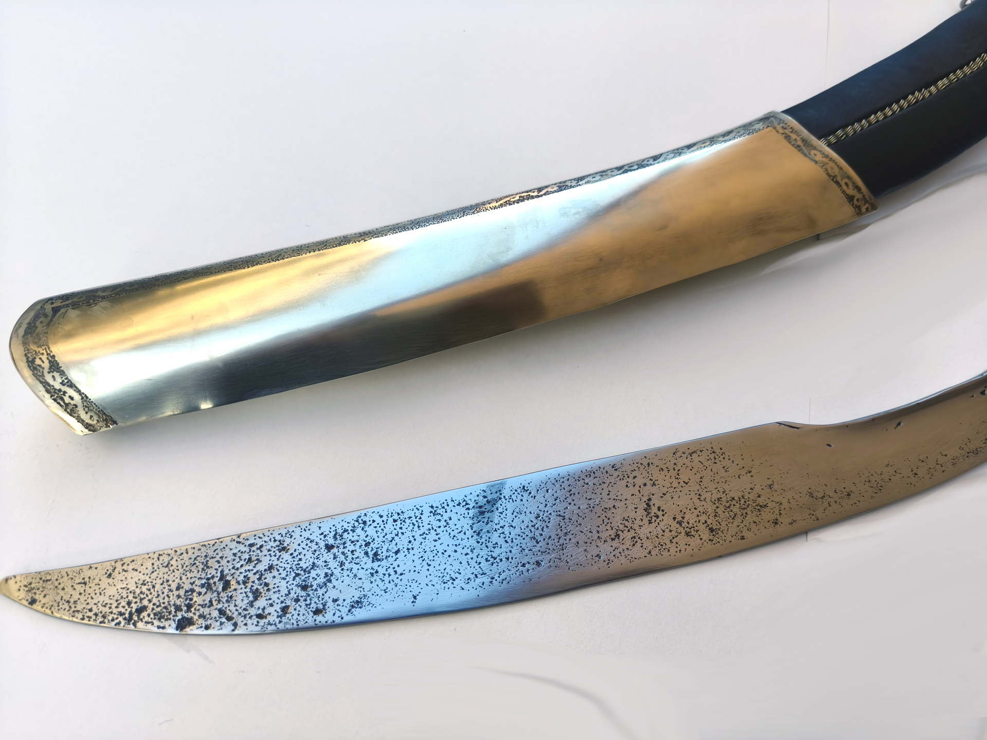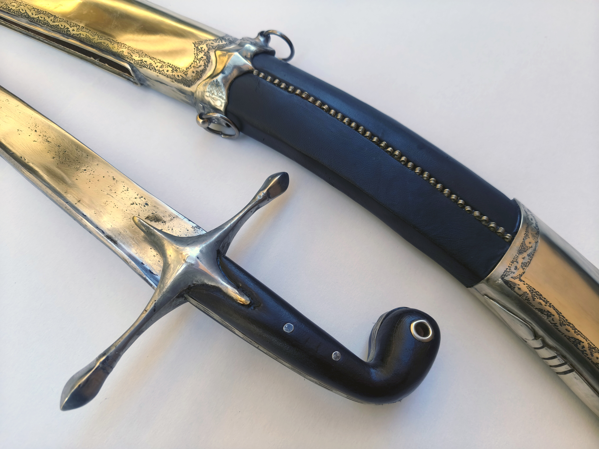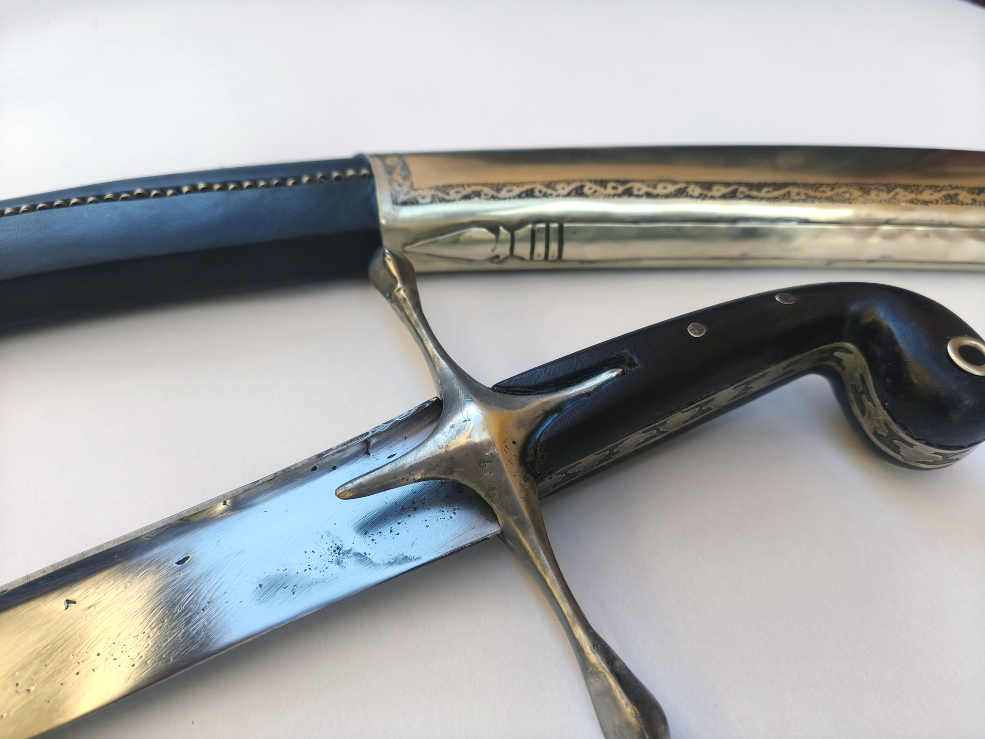 The inner side of the blade reveals the forged central ridge, showcasing the craftsmanship of its making. The scabbard is lined with leather and german silver. It comes with a string with tassels for hanging and a tassel for the handle in the color of your choice.
