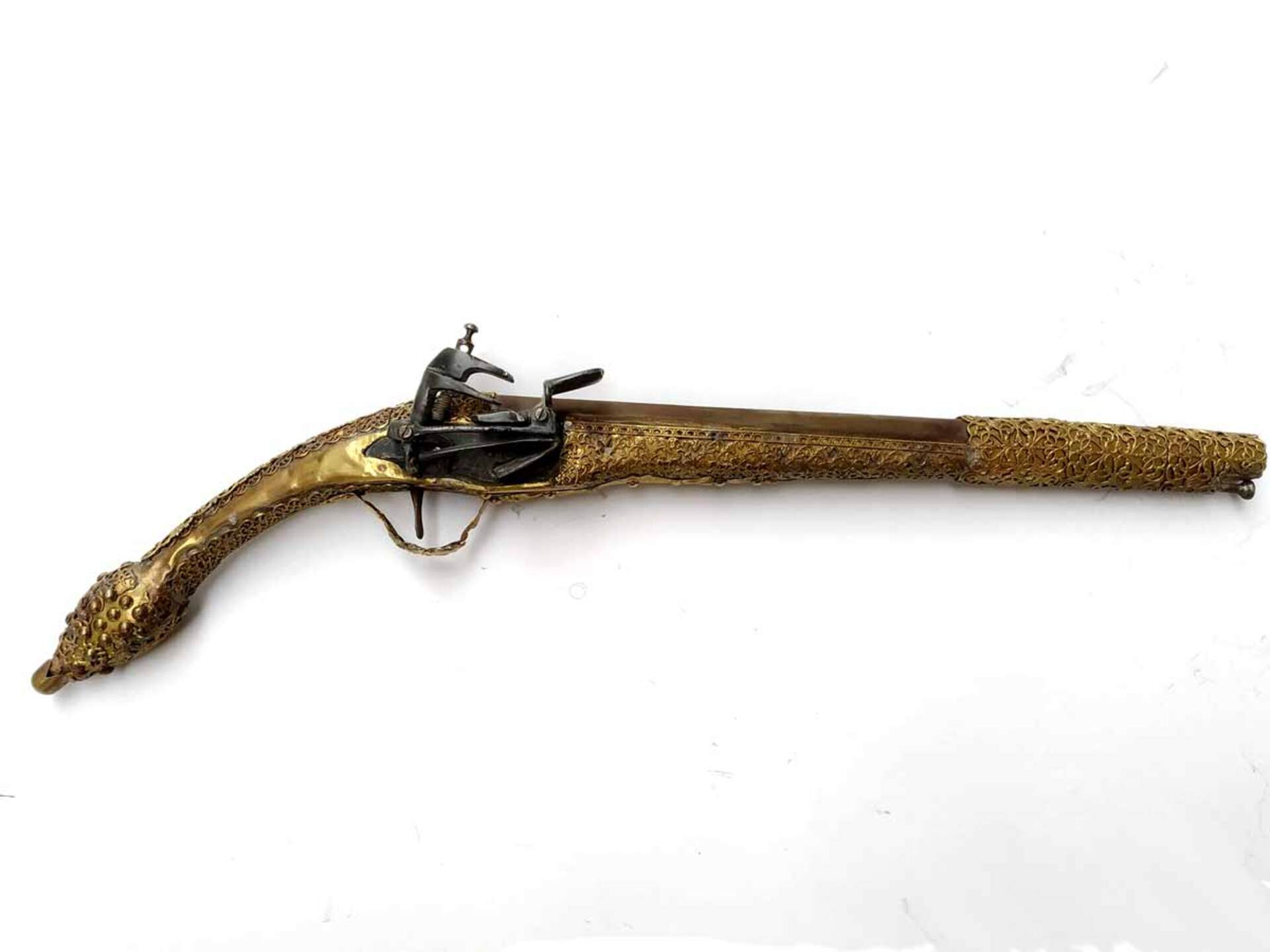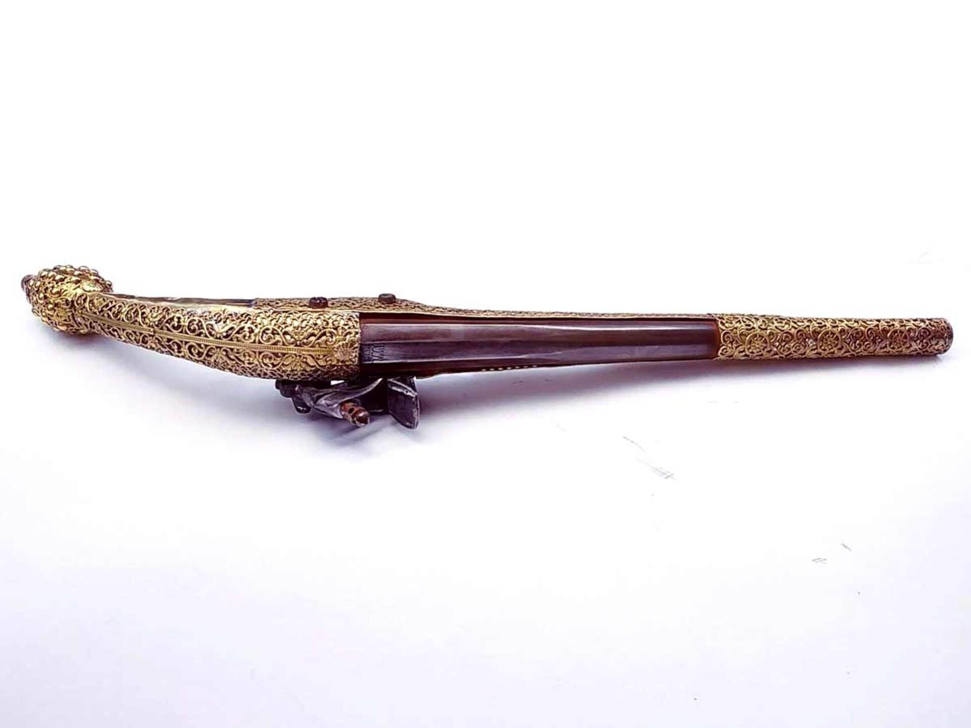 Featuring an octagonal barrel (34 cm) that ends in a round shape and a classic miquelet mechanism, this replica remains faithful to the original design. With a total length of 53 cm, it makes an exceptional piece for collectors, history enthusiasts, or as a striking decorative item.