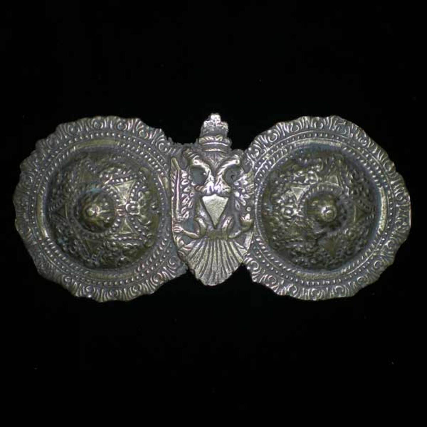Large cast buckle. The Two-Headed Aetos is visible in the middle where it separates and fastens with a hook and loop. Carved figures that reveal flowers. At both ends there are hooks for the buckle to be attached to a woman's belt and then tighten the woman's waist.