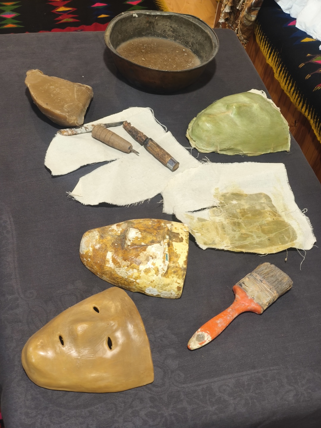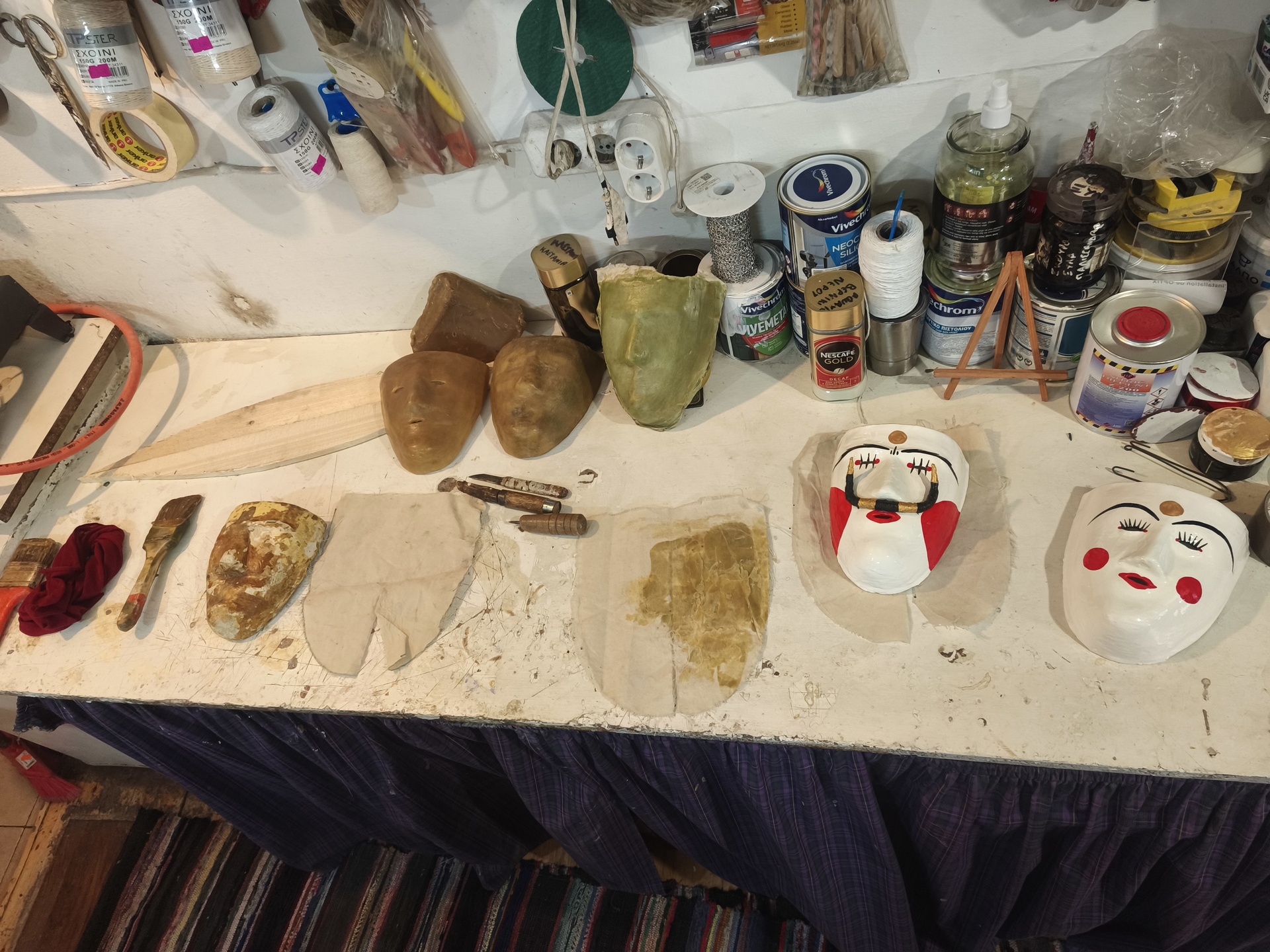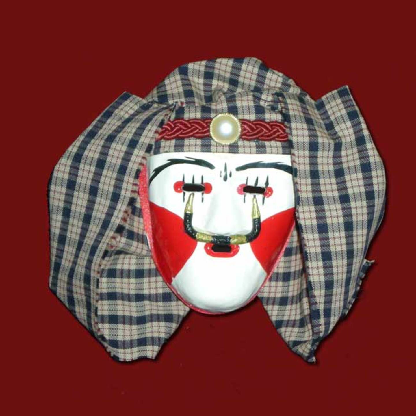 The mask is made of wax, cast in a plaster mold, and painted with oil colors following traditional techniques. It is adorned with a miniature tarampoulos (headpiece) and can be easily hung on a wall, serving as an impressive decorative piece that combines folk artistry with cultural heritage.