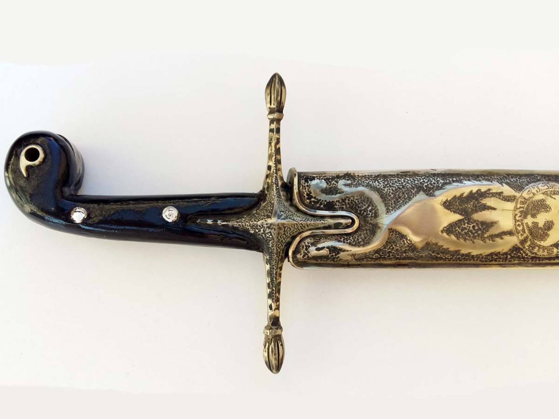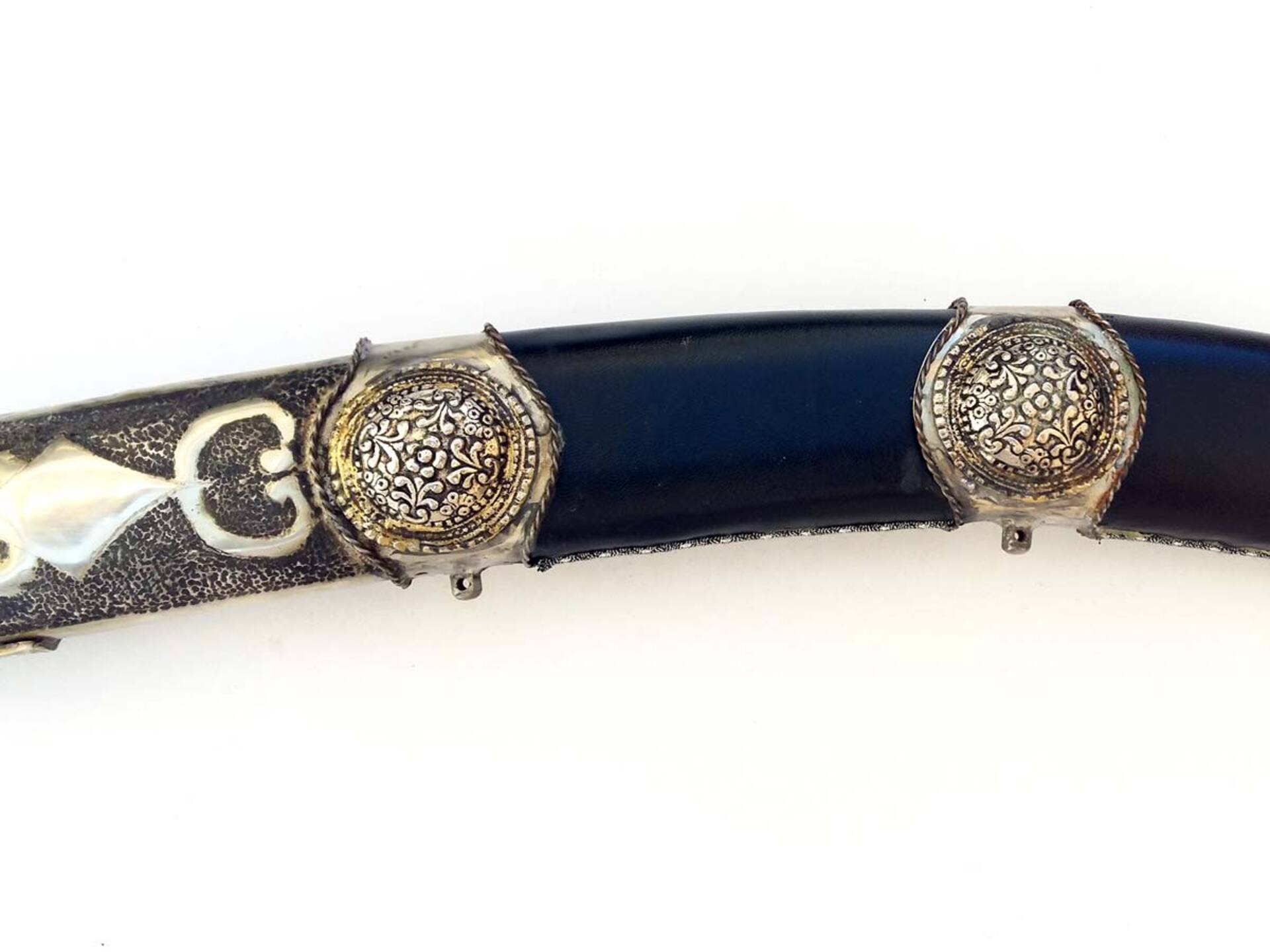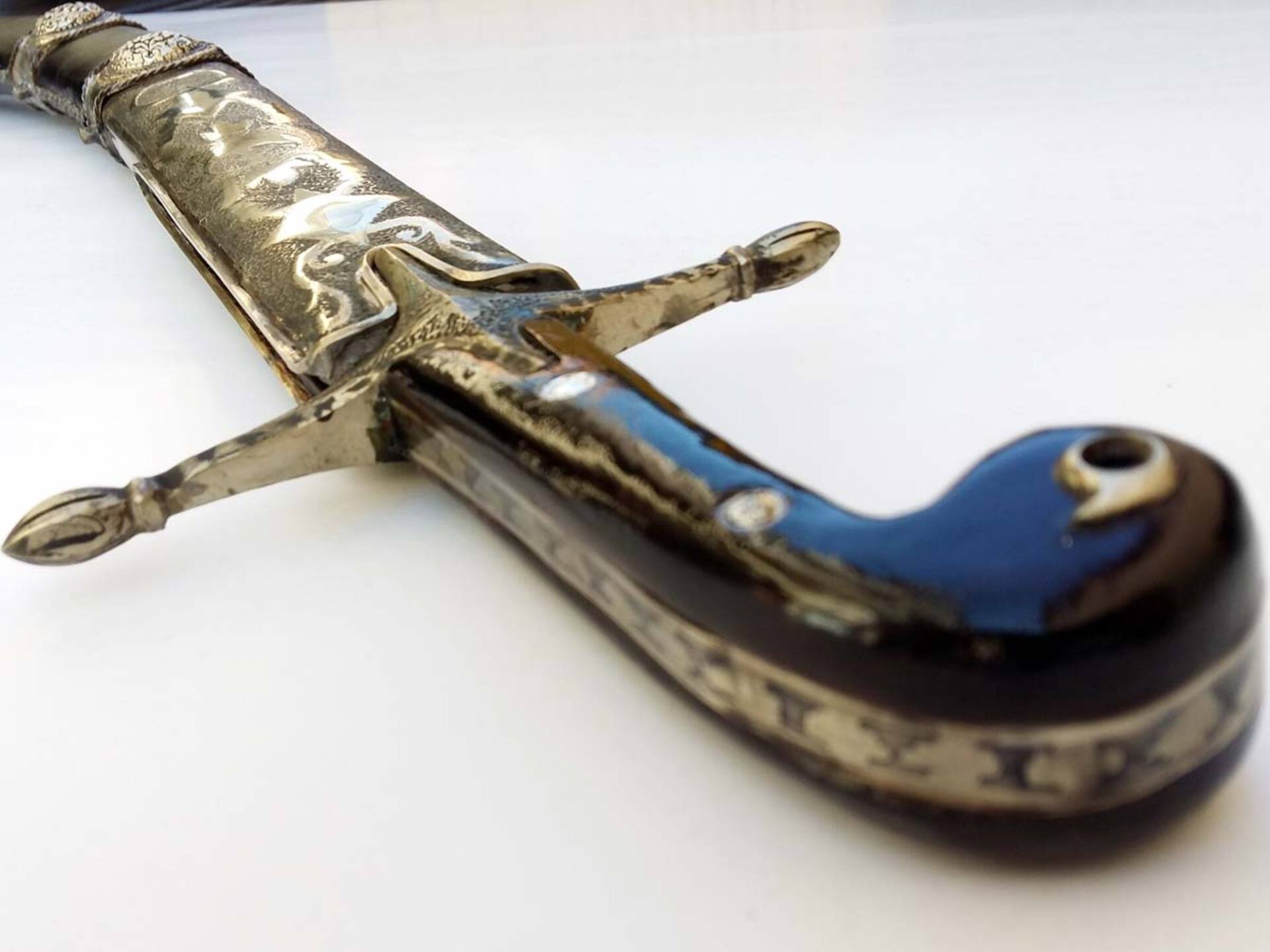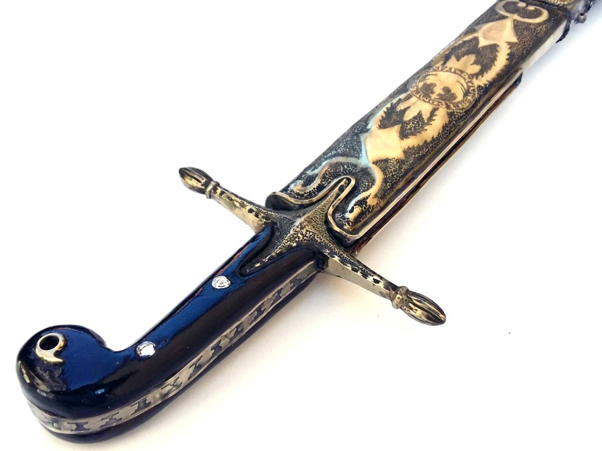 Its ornamented scabbard, detailed with engraved metal fittings and traditional motifs, evokes the prestige and artistry of Eastern sword-making traditions.
