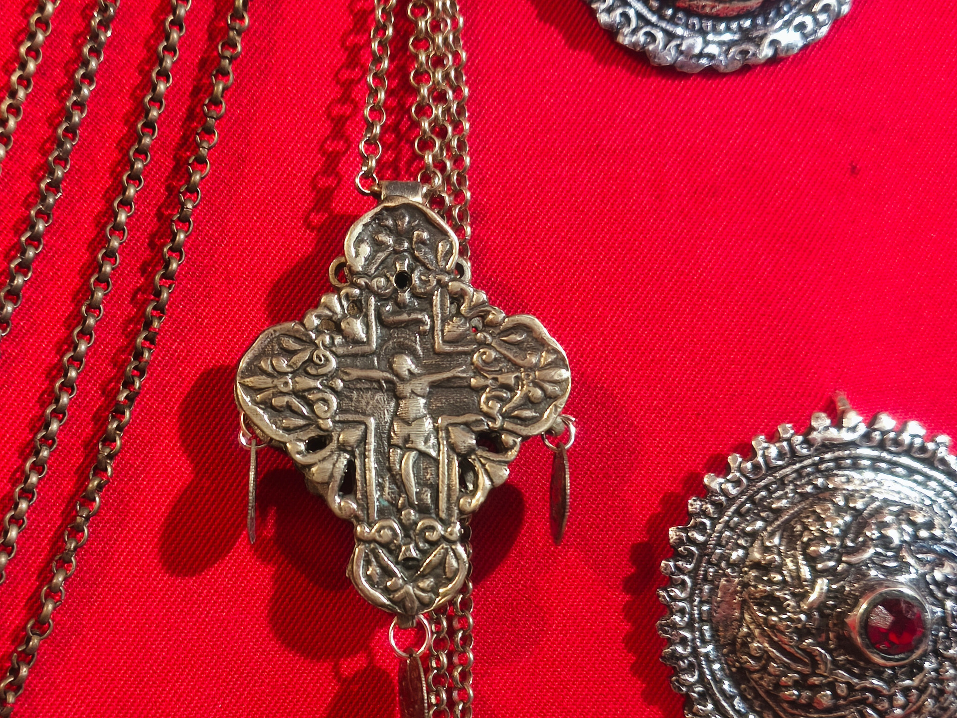 Cast bronze cross with a finely perforated design and hanging leaves. This traditional amulet was historically used to hold cotton with holy oil or a small sacred relic inside. Such crosses were often worn on the chest as part of traditional Greek costumes, symbolizing faith and protection.
